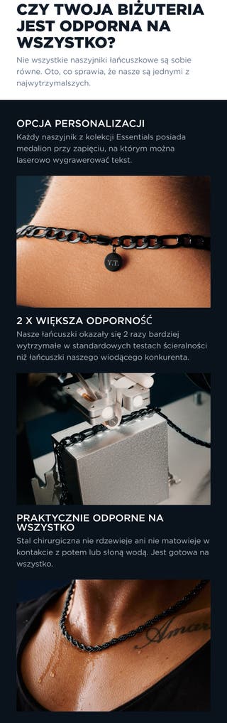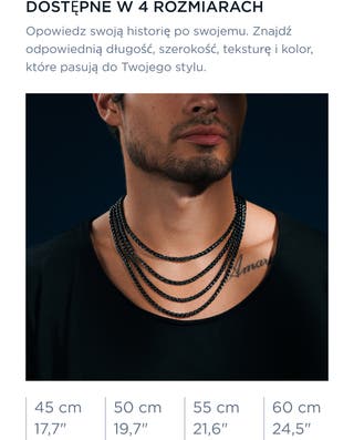Wąski łańcuszek subtelnie odbija światło, tworząc jednolitą, gładką powierzchnię, która po założeniu wygląda czysto i nowocześnie. Czarne wykończenie łatwo pasuje do koszul, kurtek i innych naszyjników przy noszeniu warstwowym. Jednolity profil pozostaje schludny zarówno pod kołnierzem, jak i na T-shircie.